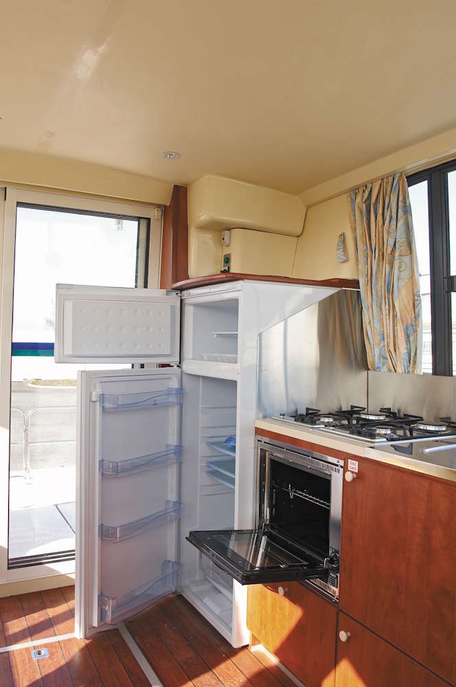 The kitchen offers a large fridge, 4 burner hob and oven whilst there is also a radio/CD/MP3 player, DVD player and connectivity to shore power supply of 220 volts. There is also plenty of storage space onboard.